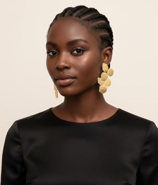 • Geometric Design: The Gilded Honeycomb Earrings feature 24k gold-plated hexagonal shapes arranged to mimic a honeycomb pattern.